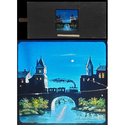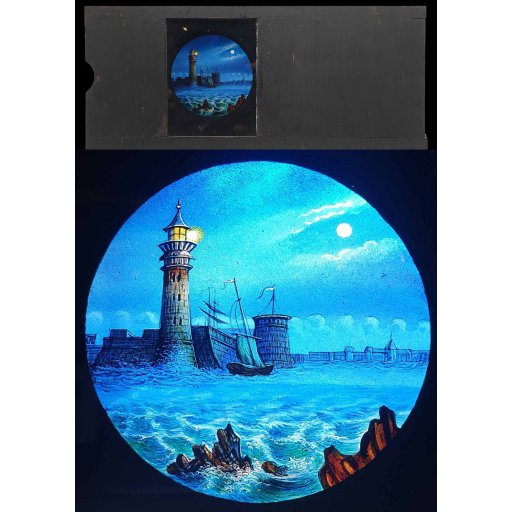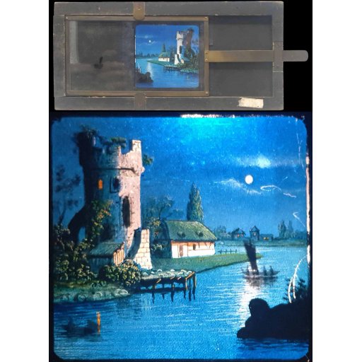 Bel état d'origine pour cette plaque animée française peinte à la main vers 1880. Bateau passant devant la chapelle de Guillaume Tell en Suisse....