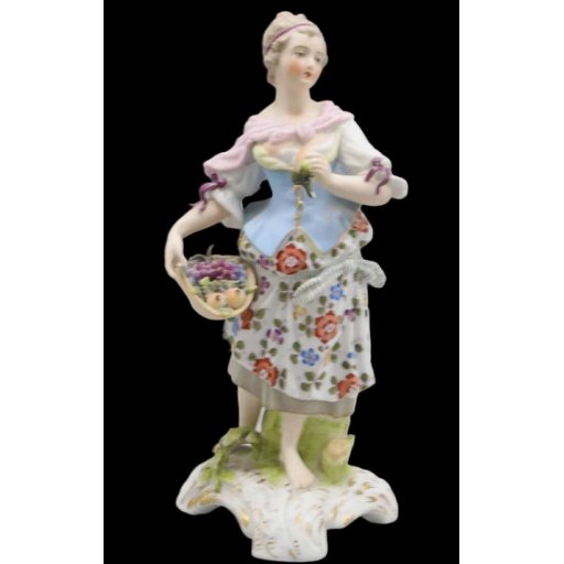 Superbe porcelaine manufacture de SITZENDORF (ALLEMAGNE, THURINGE), une jeune fille tient dans son chapeau différents fruits....