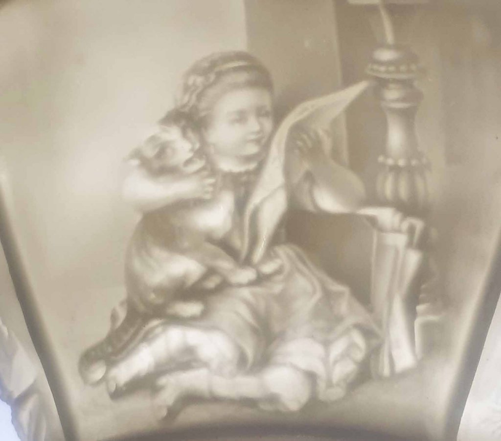 Joli décor à 4 scènes sur le thème de l'enfance. Fillette et son chat - le jeune militaire et son chien - enfants se rendant à l'école - fillette à sa fenêtre.