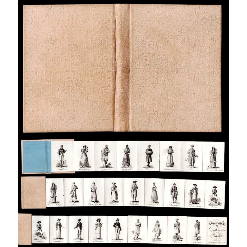 Petit et rare dépliant vers 1830 intitulé COSTUMES DE DIFFÉRENTS PEUPLES à Paris chez Marcilly, rue St Jacques N° 10.....
