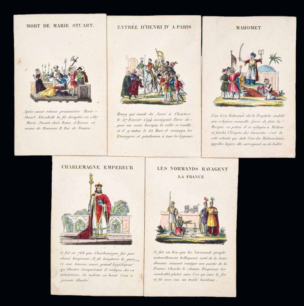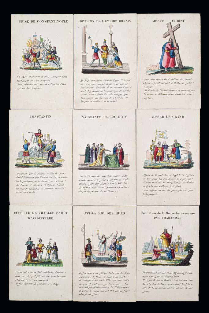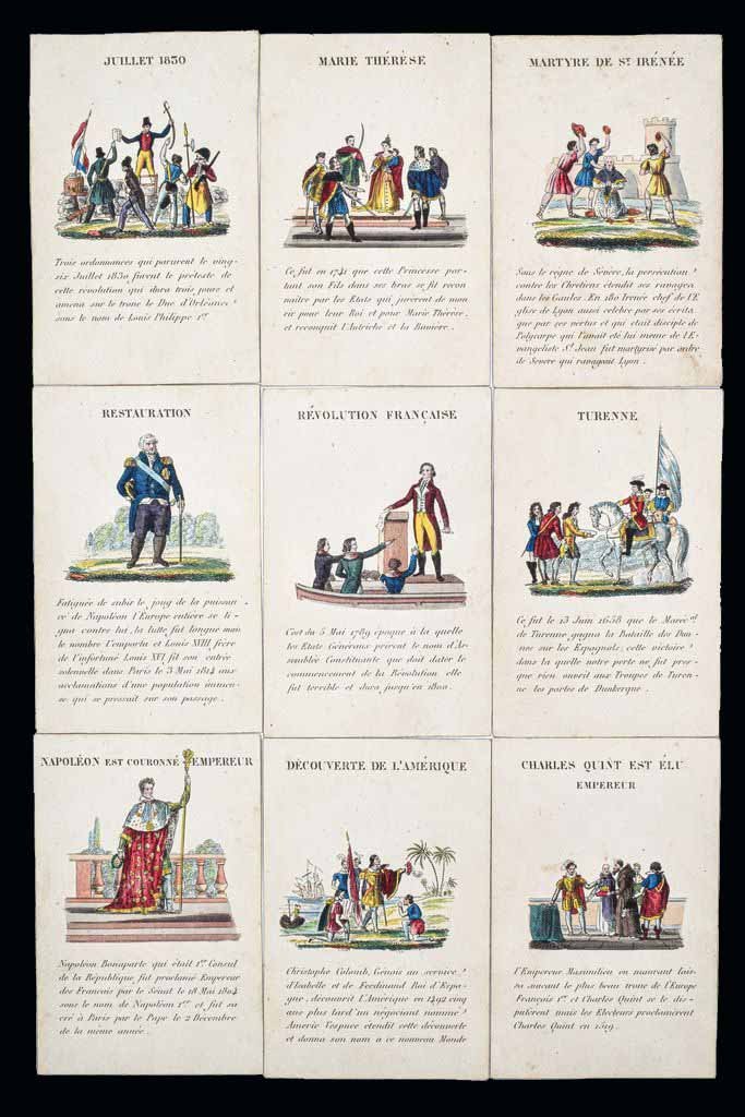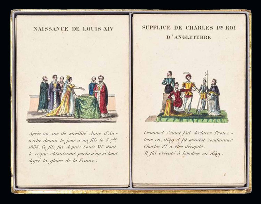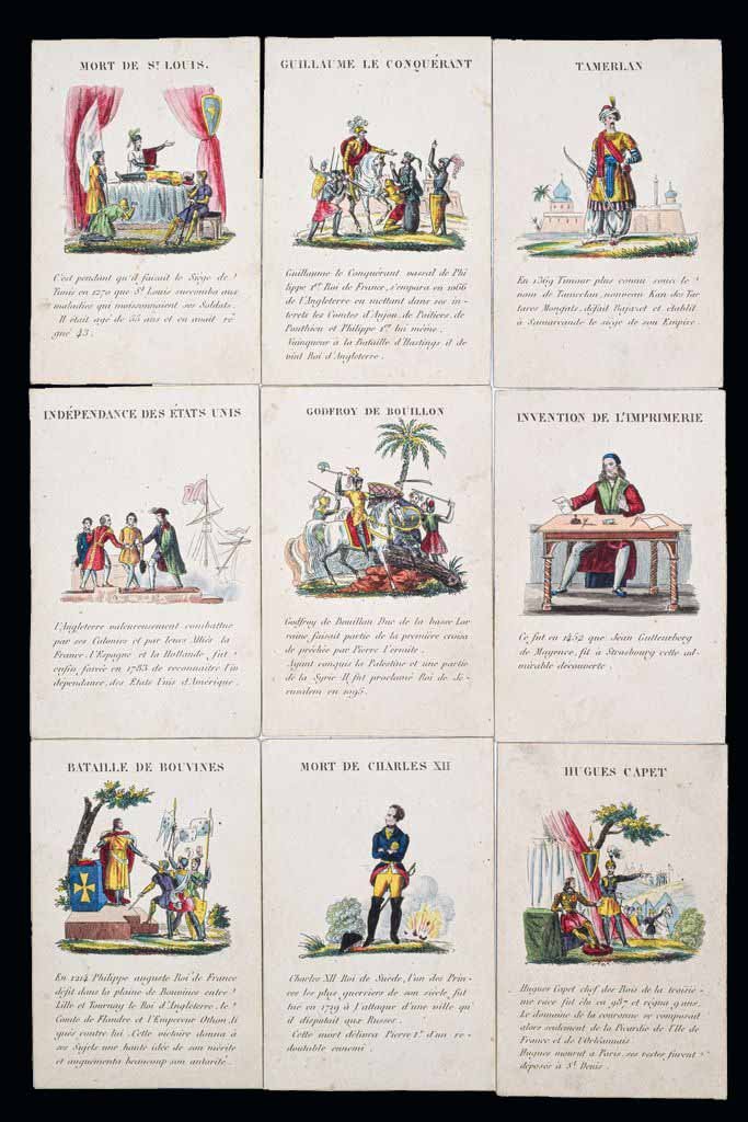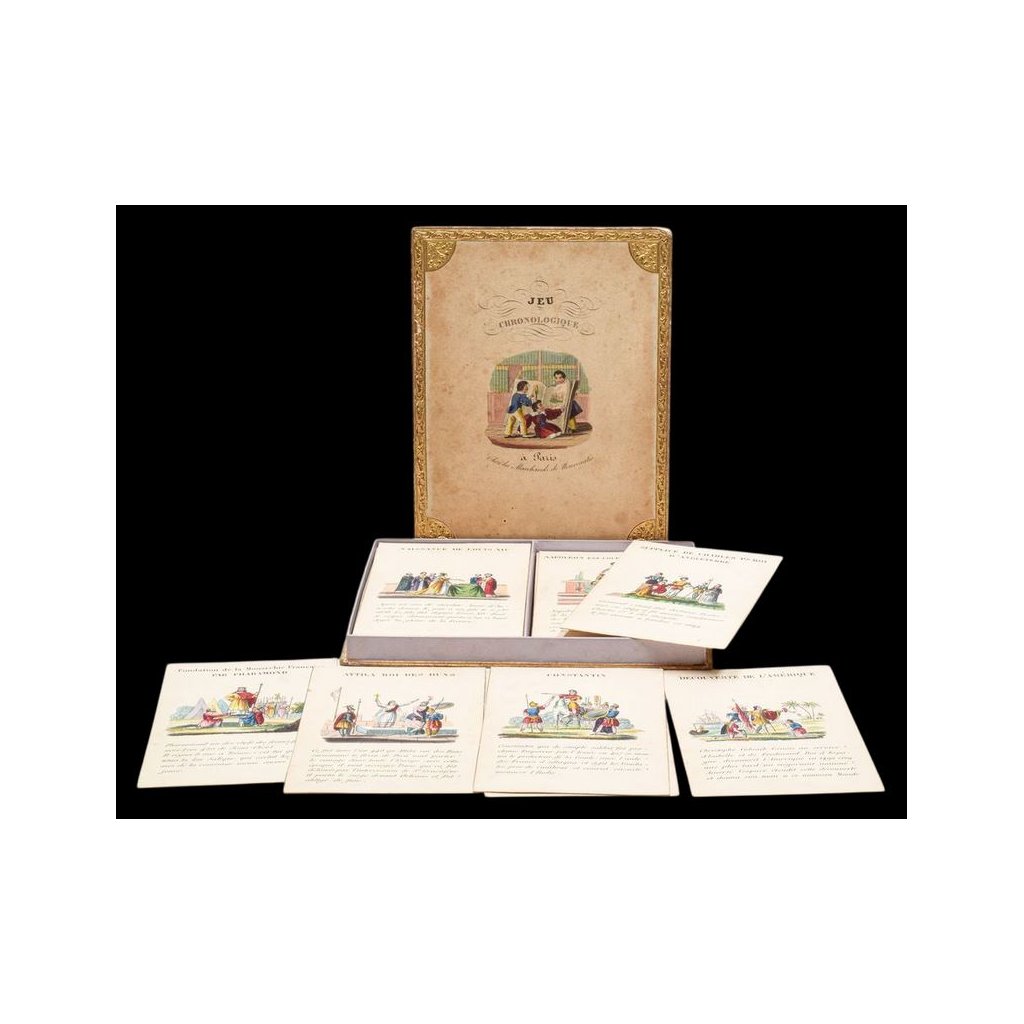 Celui-ci est bien complet de ses 32 cartes toutes mises en couleurs d’époque, le tout placé dans sa boite d’origine, illustrée au premier plat d’une autre figure gravée et aquarellée en coloris d’époque, encadrement de galon doré au premier plat, cartes en excellent état, boitier en très belle condition, minimes frottements et défauts sans gravité pour un jeu souvent malmené du fait qu’il était généralement manipulé par des enfants.