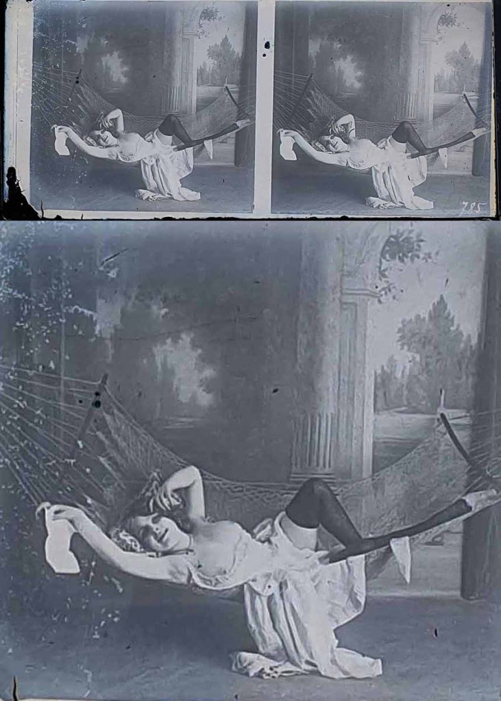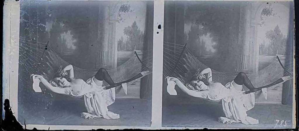 NÉGATIF STÉRÉO ÉROTIQUE DE NU FÉMININ sur verre, vers 1920. 6 X 13 cm